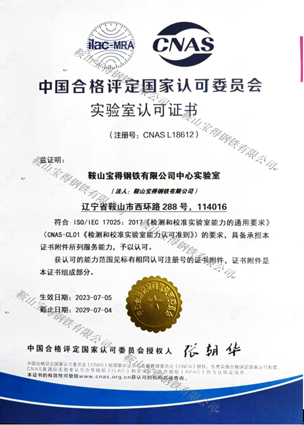 喜訊!鞍山寶得鋼鐵有限公司中心實(shí)驗(yàn)室獲得 CNAS實(shí)驗(yàn)室認(rèn)可證書(shū)
