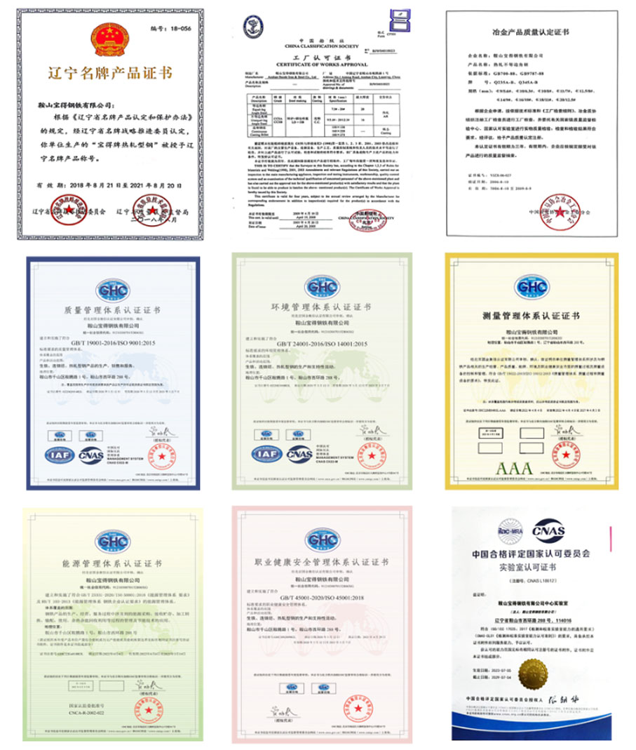 “寶得”牌鋼材以科學(xué)的管理,先進的裝備,嚴格的檢測為保障,產(chǎn)品外型尺寸精度高,成分穩(wěn)定,性能可靠,表面質(zhì)量好,實物質(zhì)量高于國家標準,達到發(fā)達國家同類產(chǎn)品水平,屢獲國家“冶金產(chǎn)品實物質(zhì)量金杯獎” 和“遼寧省名牌產(chǎn)品”稱號。公司通過了GB/T 19001/ISO 9001質(zhì)量管理體系、GB/T 24001/ ISO 14001環(huán)境管理體系、GB/T 45001/ISO 45001職業(yè)健康安全管理體系、GB/T 23331 / ISO 50001和RB/T 103能源管理體系、GB/T 19022/ISO 10012測量管理體系審核認證,獲得方圓標志認證中心頒發(fā)的“管理創(chuàng)新獎”,取得國家船級社(CCS)的生產(chǎn)工廠認可證書和遼寧省進出口檢驗檢疫局頒發(fā)的“產(chǎn)品出口免檢認可證書”。